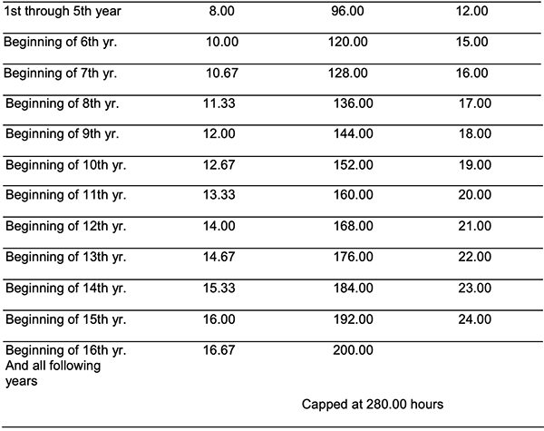 - If twelve (12) hours of vacation per month are granted during the first year of employment, the employee shall earn sixteen (16) hours of vacation per month beginning with the fourth year of employment.